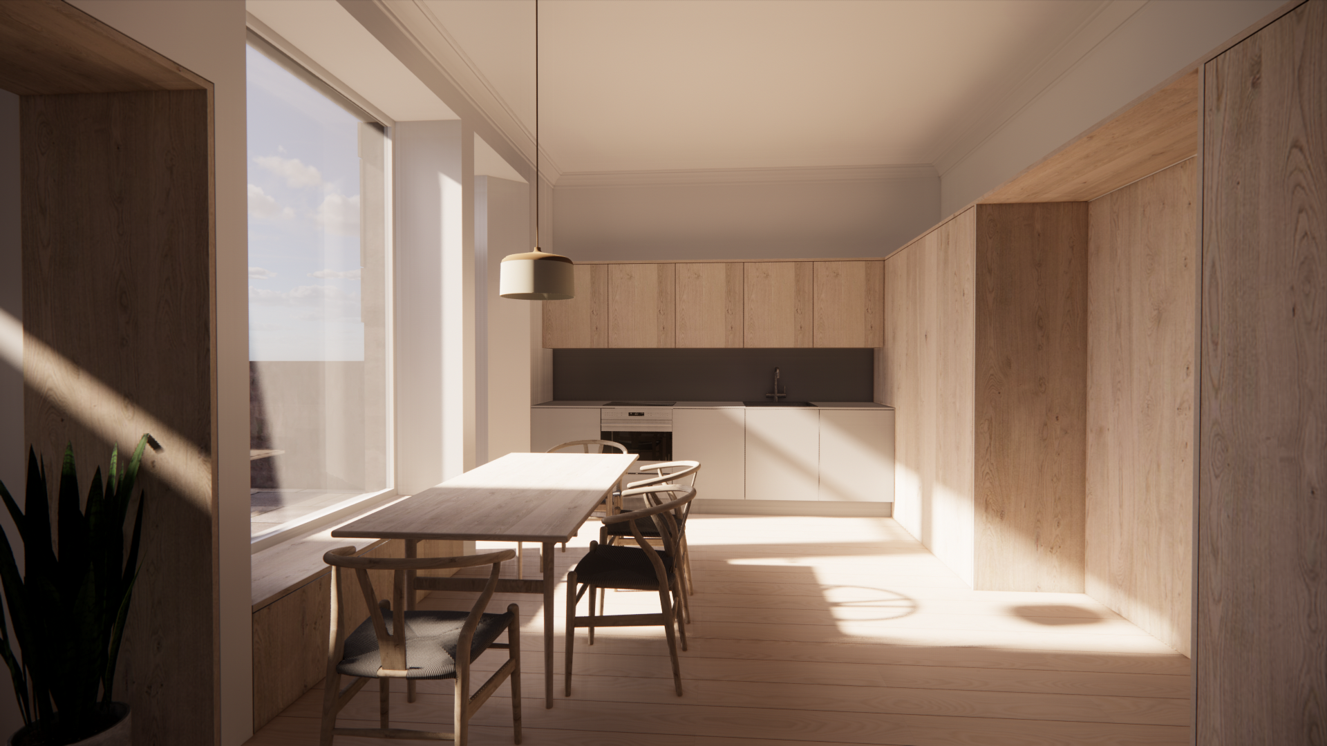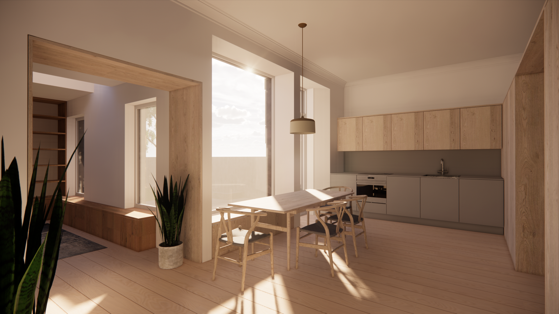 The proposal creates a contemporary, spacious, family-friendly kitchen and dining area to enhance comfort while modernising the existing amenities. The dark, cramped utility space is transformed into a cosy snug with views into the garden and flooded with daylight.