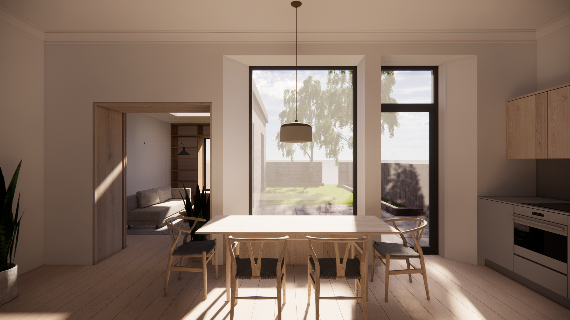 Enlarging the window on one side to a full-height glazed door opening provides easy access to the garden. The large window on the opposite side is replaced and resized, optimizing space for storage while maintaining daylight.