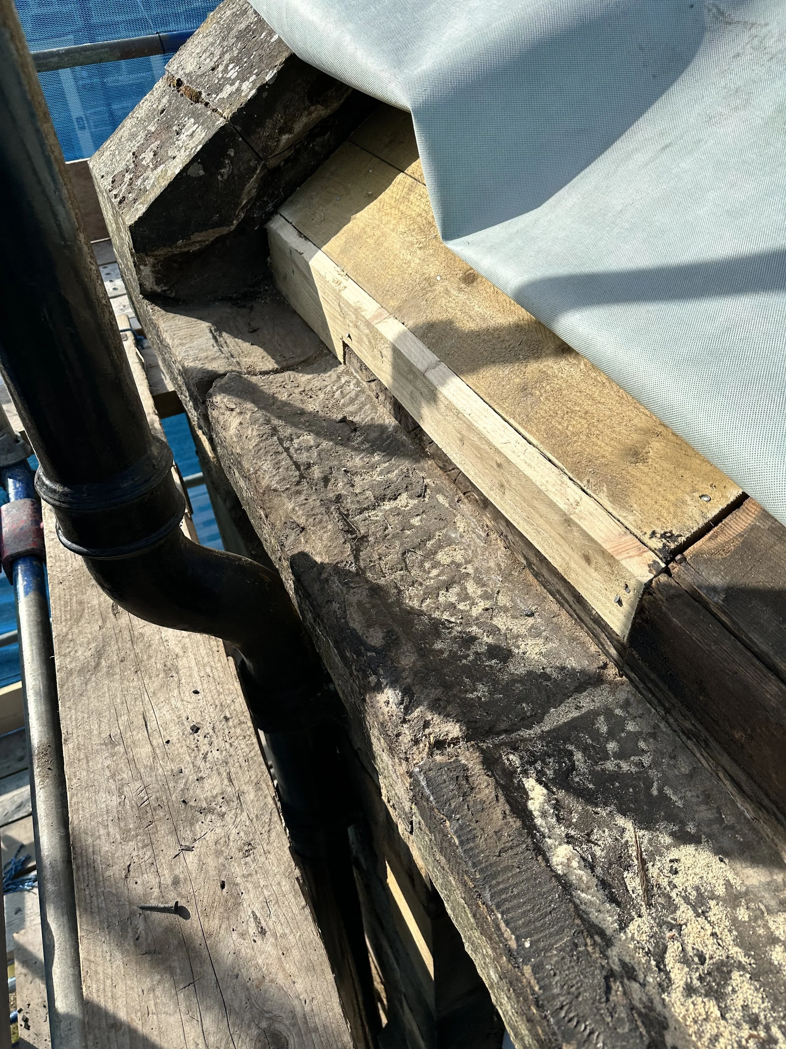 From the outset, the building told a clear story: years of subsidence had caused the street elevation to visibly lean outward, and a poorly maintained roof and damaged rainwater goods had left the stonework weathered and vulnerable. Removing internal linings revealed fragile separating walls between dwellings, and it was clear the building had been poorly adapted over time.